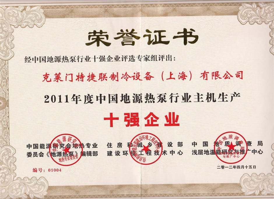 連續(xù)多年獲得“ 年度中國地源熱泵行業(yè)主機(jī)生產(chǎn)十強(qiáng)企業(yè) ”獎項
